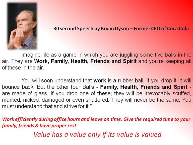 A: Like Narayan Murthy had said - love your job and not your company because you never know when your company will stop loving you. In the same lines, love yourself and your family needs more than the company's needs. Companies can keep coming and going; family will always remain the same. Make money for yourself first and simultaneously make money for the company, not the other way around.